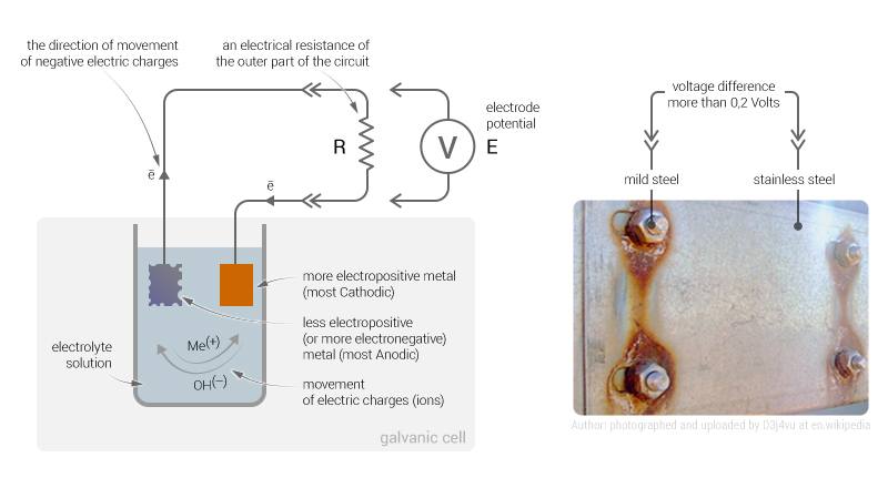 Galvanic compatibility could also be predicted by considering the anodic index (electrochemical voltage developed between the metal and gold) of the metals. A difference of 0.25 V – 0.5 V between the anodic indices of the two metals is acceptable in controlled environments, while the same should ideally not be more than 0.15 V in harsh environments like those with high humidity and salt content.