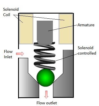 The flow rate is controlled by the upward/downward motion of the poppet. Poppet is connected with a sphere/disk at the bottom and as the poppet moves upward, the gap between poppet and seat increases and hence, flow rate increases. Actuation force depends upon the system pressure and hence actuation is controlled by solenoids.